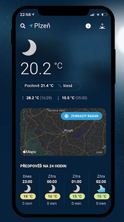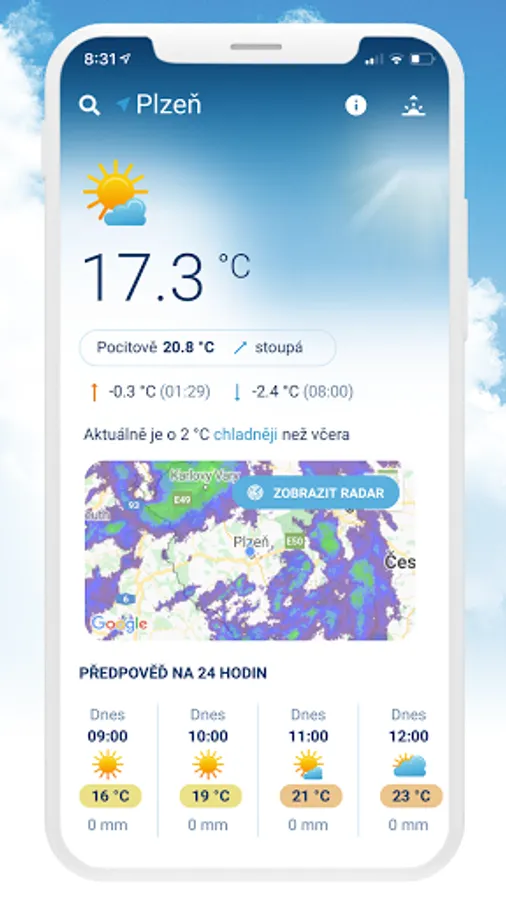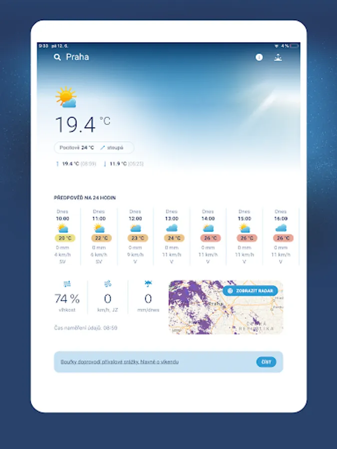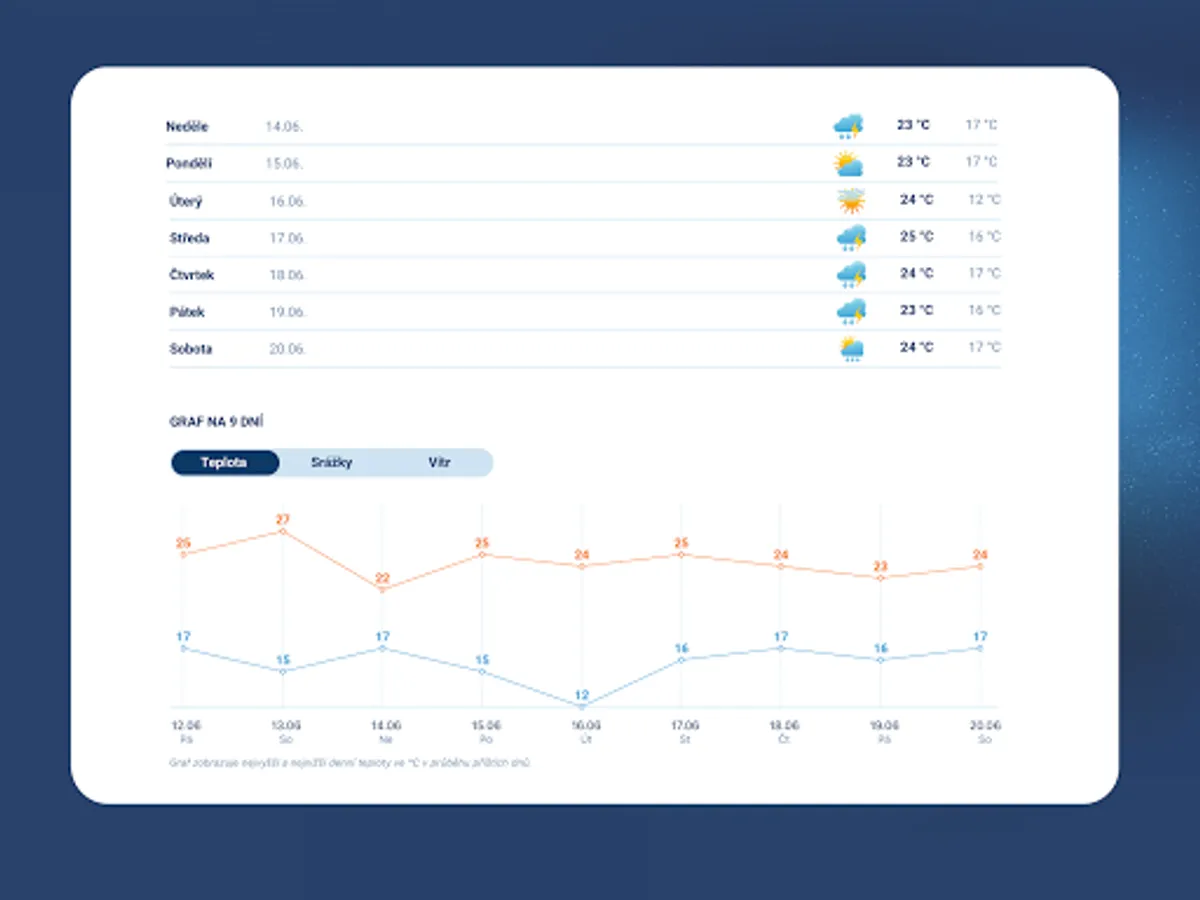 The forecasts are regularly updated and prepared by meteorologists from the In-weather portal. The data for the application are created directly in the Czech Republic and are regularly checked. The application uses a dense network of meteorological stations throughout our territory. In their immediate vicinity, the application displays the current outdoor temperature to one tenth of a degree exactly.