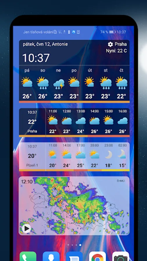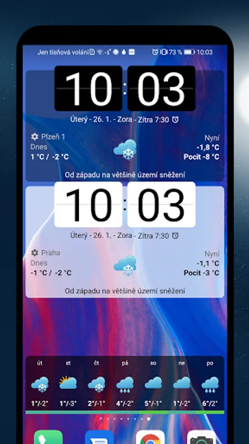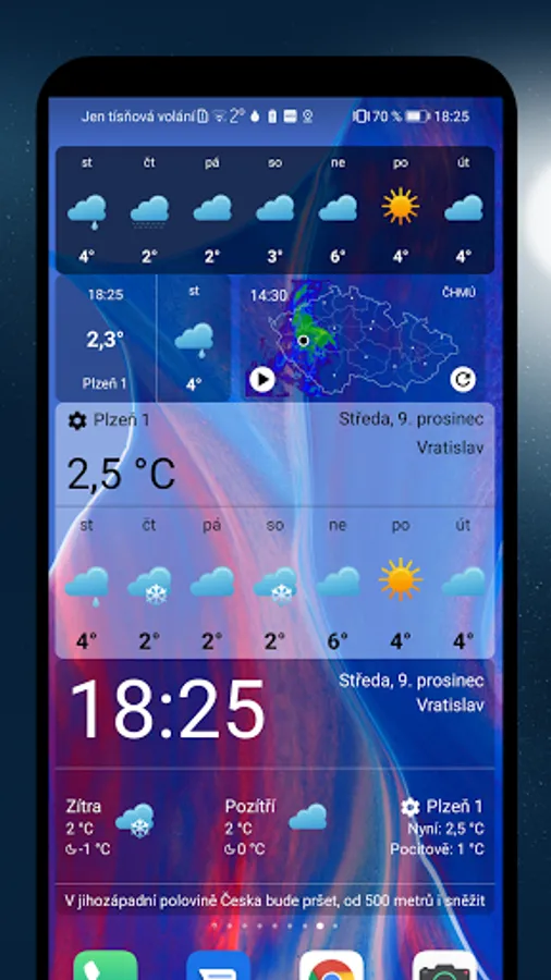 In-weather is a popular Czech application free and without ads, which displays the current outdoor temperature and weather forecast. The data is updated every 30 minutes and thus always corresponds to the actual measured values at the location. The application offers a rich number of widgets with information about the weather, time, alarm clock or holidays. There are also daily updated forecasts. All this is set in a pleasant and clear design.