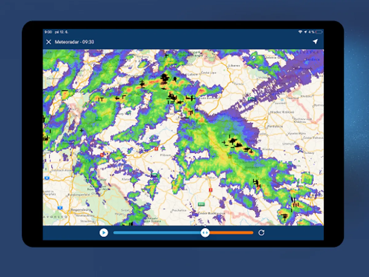You can view the exact development of precipitation in the application using data from radars, which capture the development of precipitation. The data is updated every 10 minutes. A radar forecast for the next hour is also available.