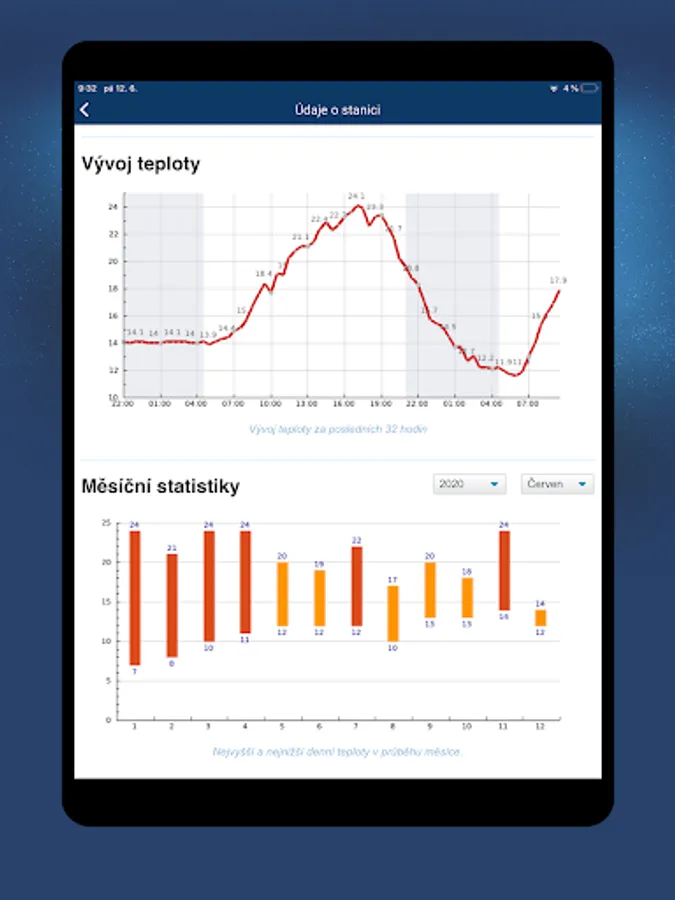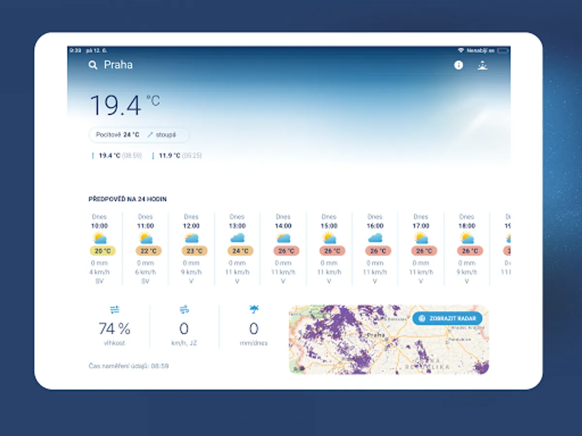 The application downloads data from a dense network of meteorological stations in the Czech Republic. In addition to professional stations, it also uses private stations located throughout the Czech Republic. In the application, you always look at accurate and current data measured in a given place.