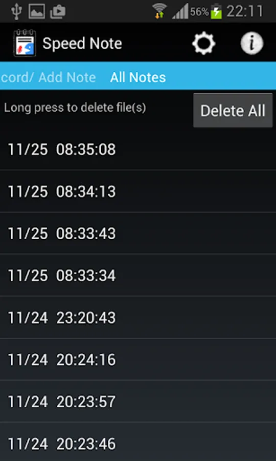 ●The interface for All Notes. You can listen to any voice note, or delete it here. Or add alarm to it for reminding you. Multiple alarm notifications can be added to each single note.