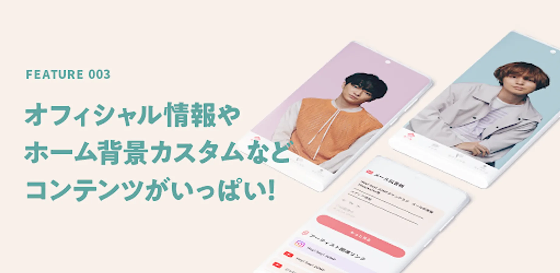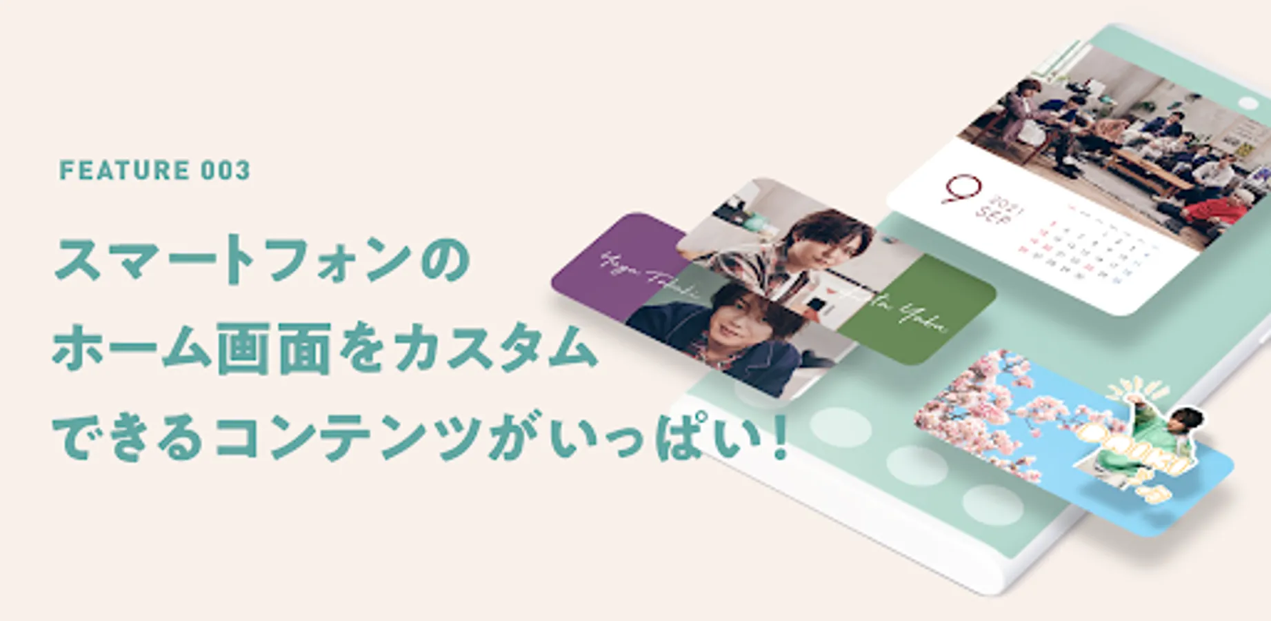 Hey! Say! JUMP Widget app "Anytime JUMP" is packed with items that allow you to enjoy app-exclusive photos. Color your smartphone's home screen with various items and spend time with "Anytime JUMP".