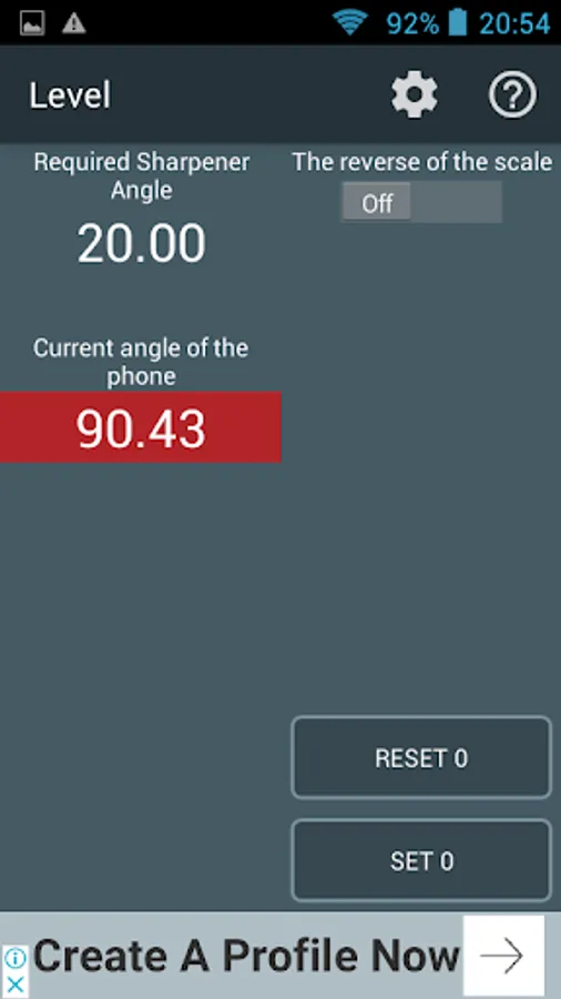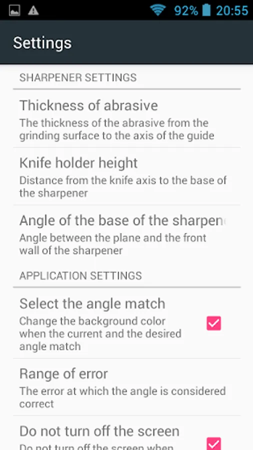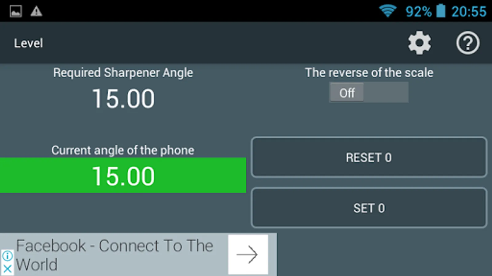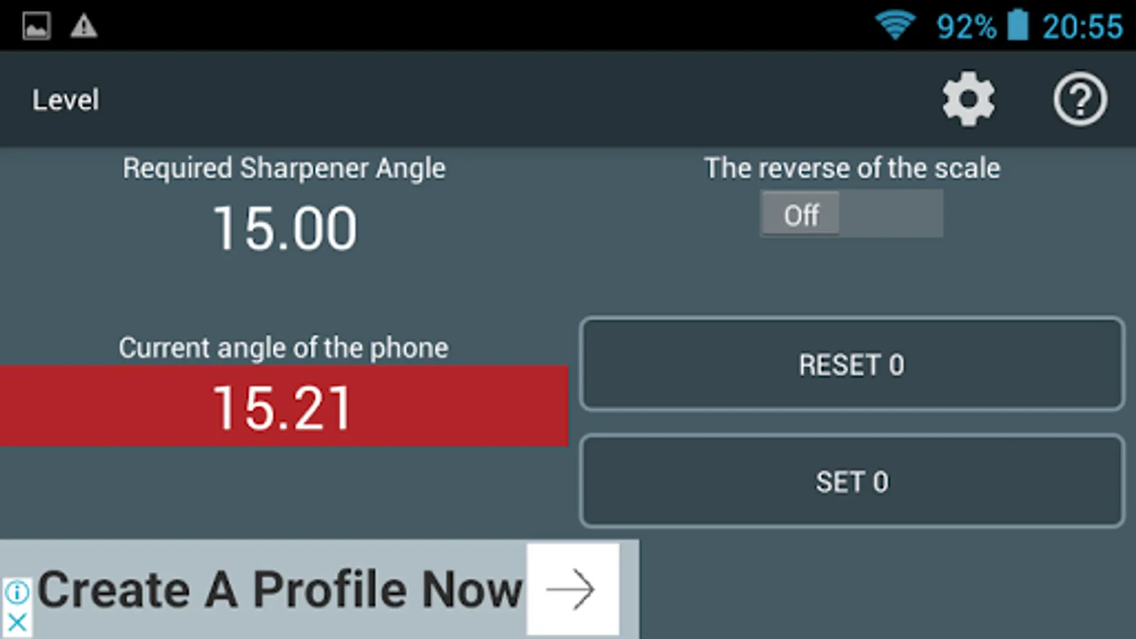 The measurement mode works only on phones equipped with an accelerometer. To set the desired angle on the sharpener, put the phone with the long side on the base of the sharpener and press the "Set 0" button. Then attach the phone to the guide and, adjusting the height, achieve the desired angle. If the indication of the correctness of the setting is turned on in the settings, the background of the field with the indication of the current angle will turn green. When measuring the angle, the phone does not need to be tilted to itself or from itself.