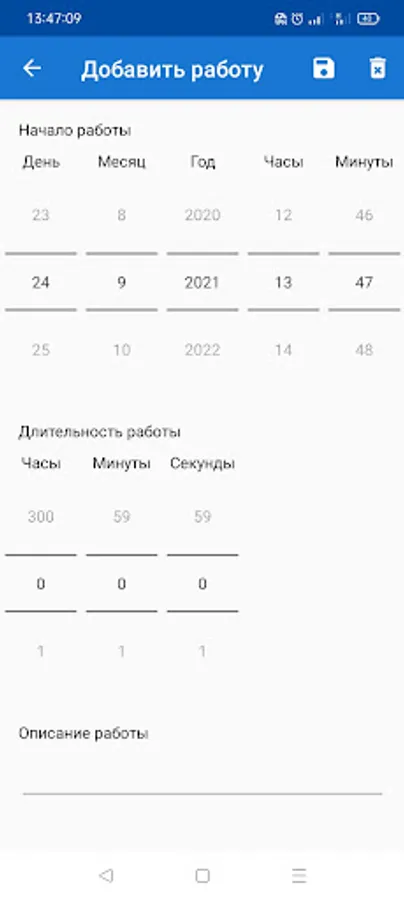 If you have not recorded the work of the motor, but you know its duration, you can add the time manually. To do this, click on