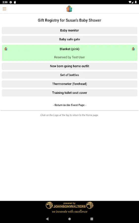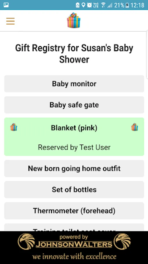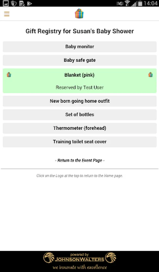 Draw up a gift registry and allow your guests to reserve gifts. Guests using the App can reserve the gifts directly using the App, but you can manually reserve the gifts for guests choosing not to use the App.
