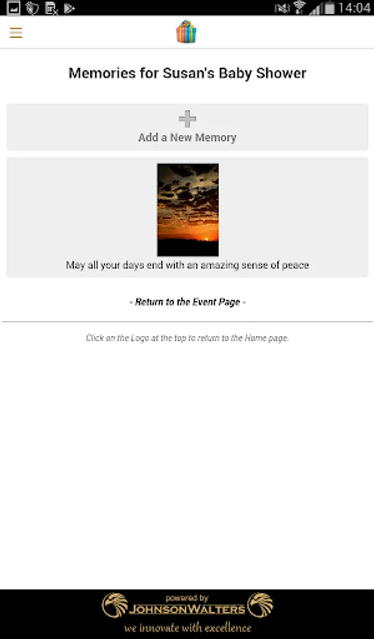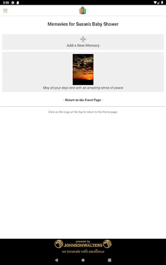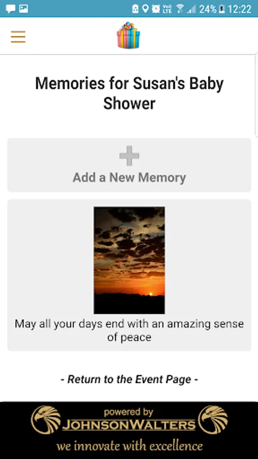 Upload photos or pictures from your device library and write an inspired message to the lucky mom to be. All guests, even those not attending the actual baby shower, can upload a memory.