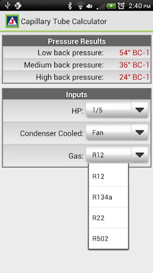 3. Capillary Tube Calculator: This module allows you to perform capillary tube look-up based upon HP, condenser cooled type, and refrigerant type.