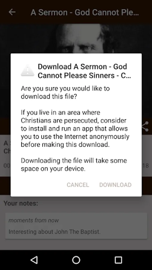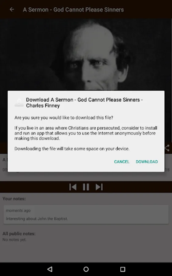 If you live in an area where Christians are persecuted, consider to install and run an app that allows you to use the Internet anonymously before installing the app and downloading audio files from Charles Finney Sermons.