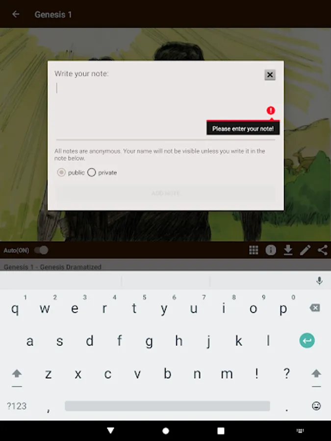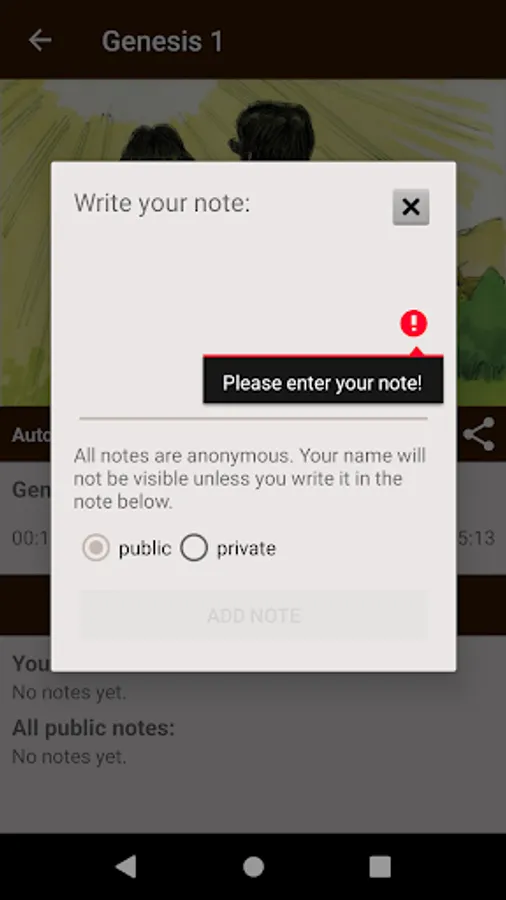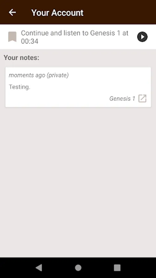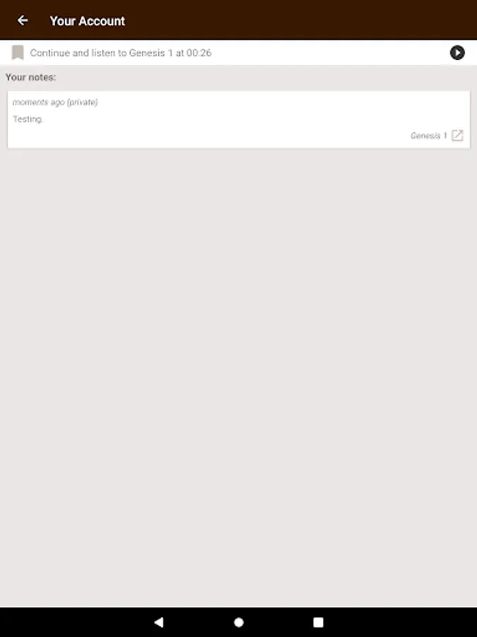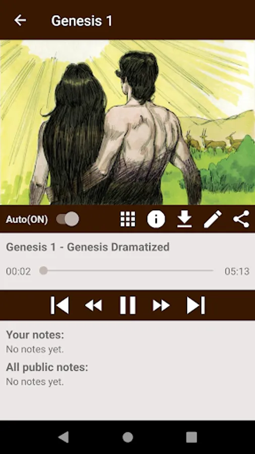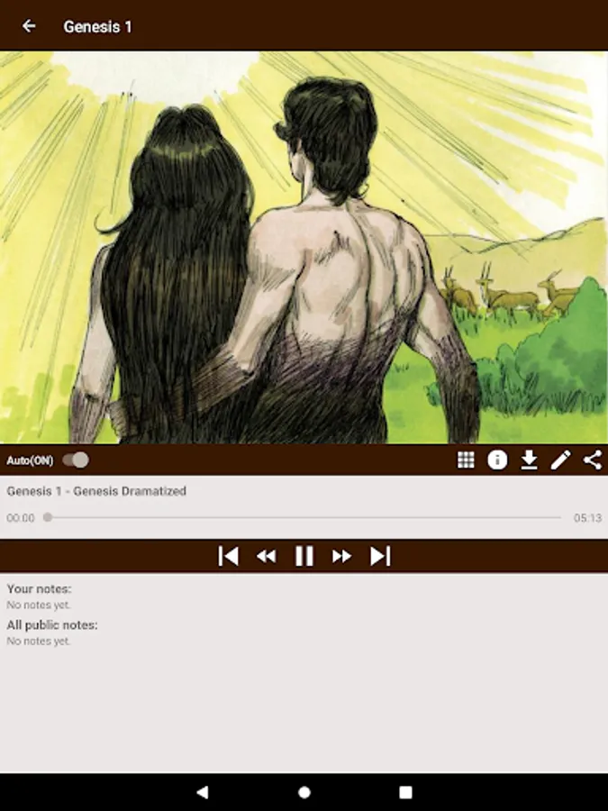 With the Genesis Dramatized Audio app you can easily write notes(public or private) next to each chapter, share chapters, view all your notes in your profile and download audio to your device if that suits you better.