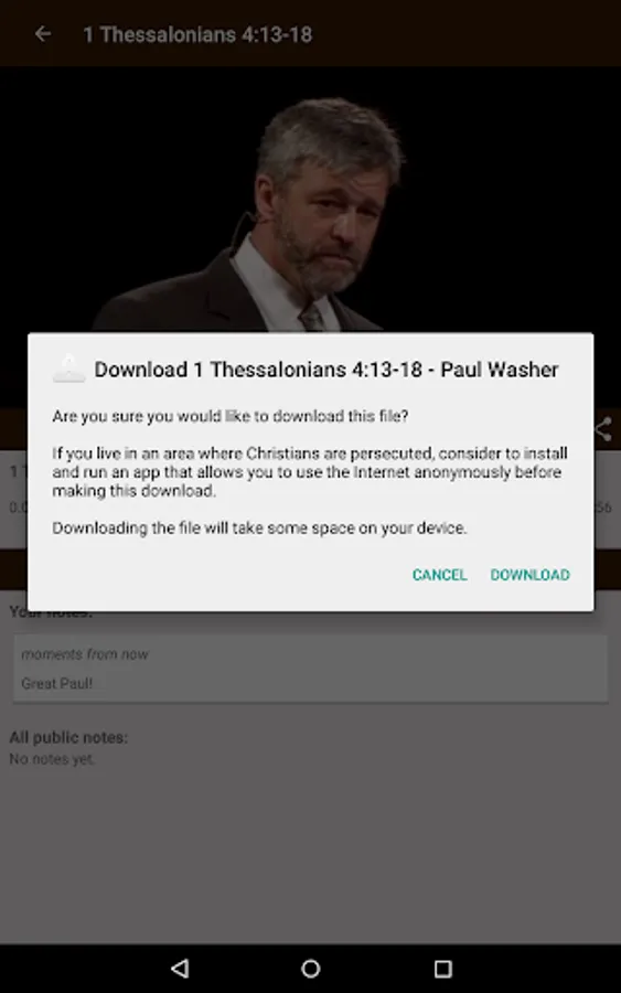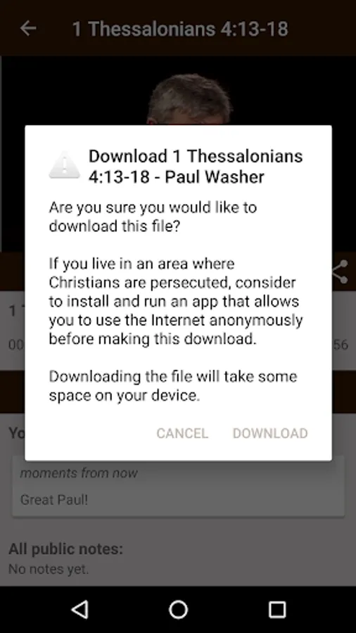 If you live in an area where Christians are persecuted, consider to install and run an app that allows you to use the Internet anonymously before installing the app and downloading audio files from Paul Washer Sermons.