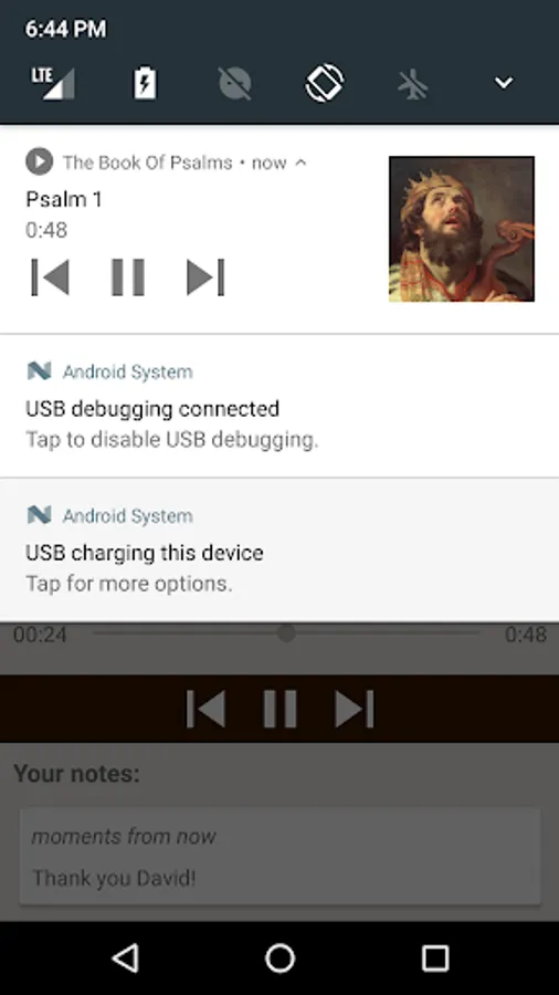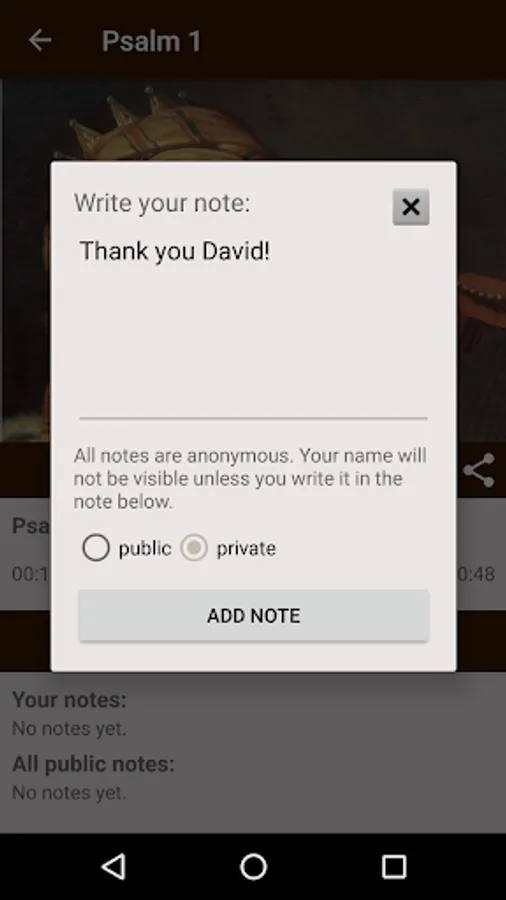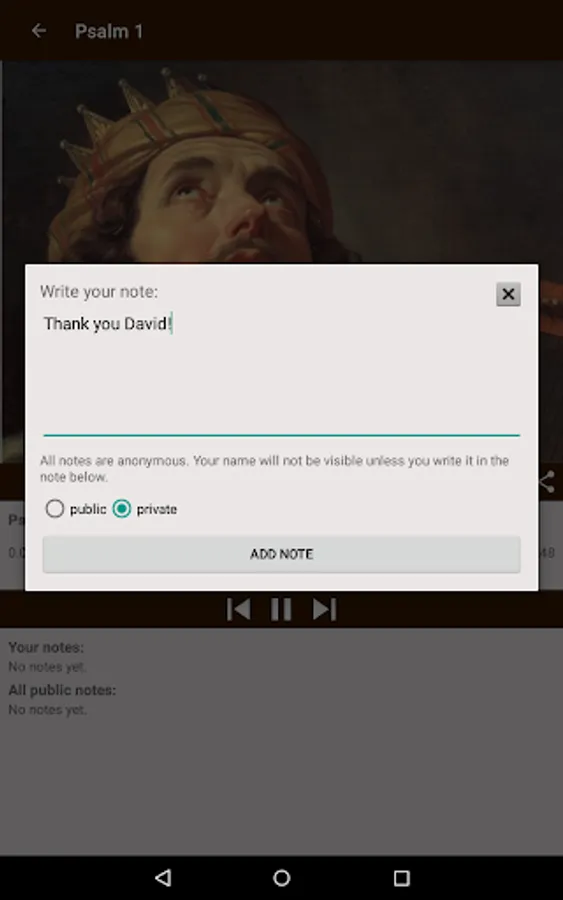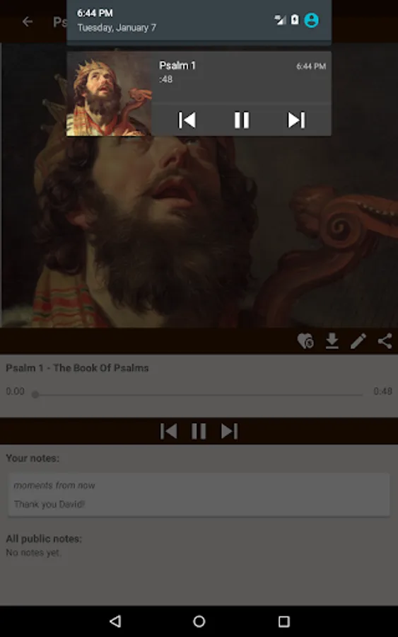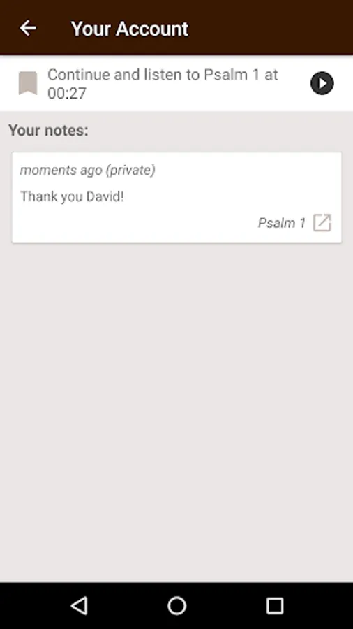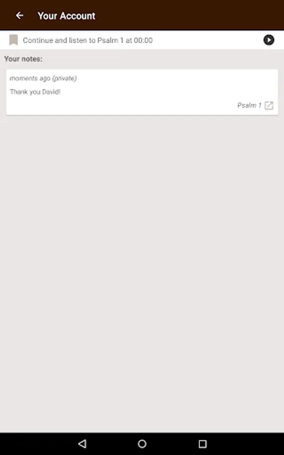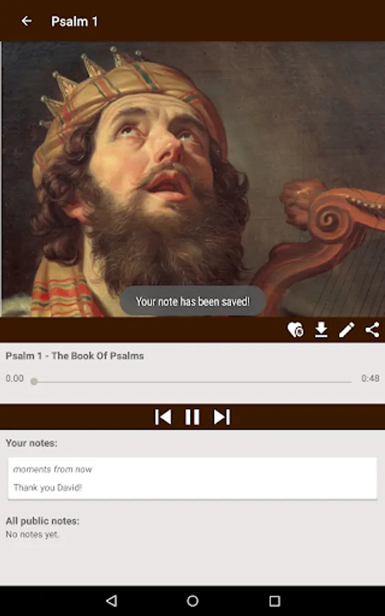 With The Book of Psalms app you can easily write notes(public or private) next to each chapter, share chapters, view all your notes in your profile and download audio to your device if that suits you better.