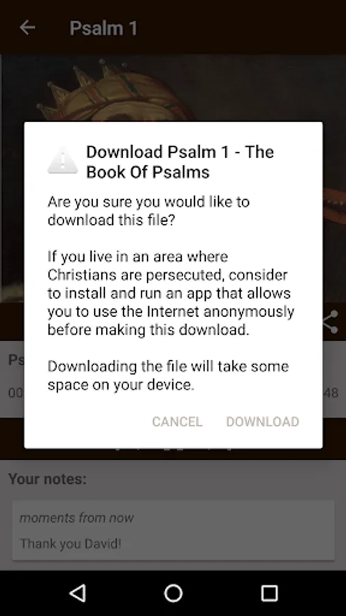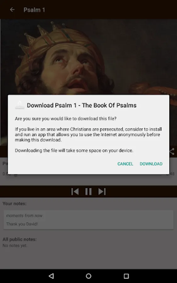 If you live in an area where Christians are persecuted, consider to install and run an app that allows you to use the Internet anonymously before installing the app and downloading audio files from The Book of Psalms.