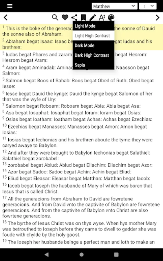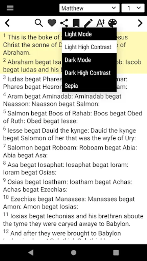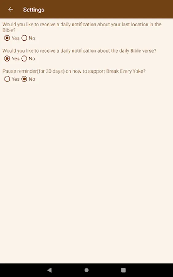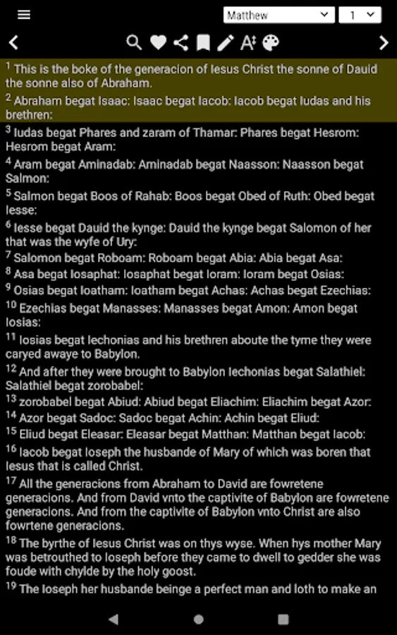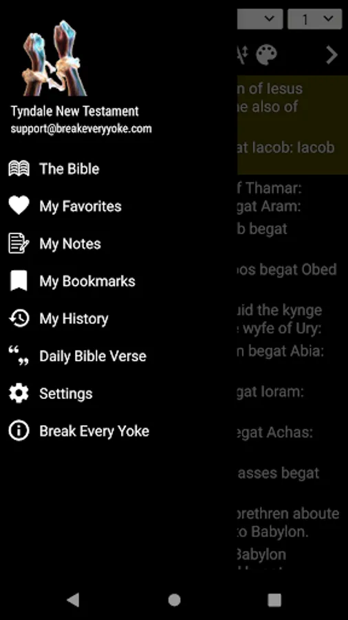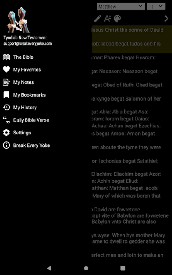 Tyndale New Testament app was made with the user in mind. It is part of the Bible project Break Every Yoke. The aim of the project is to provide offline Bibles to all peoples of the Earth, in their own language. You can read more about Break Every Yoke on the link below.