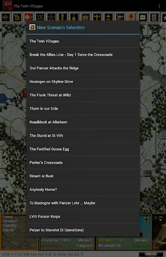 This release includes 15 historical and hypothetical scenarios based on the PC Panzer Campaigns game of the same name. These scenarios allow you to play the part of different German commanders during the battle against the AI commanding the Allies. The scenarios range from the attacks by Peiper in the north of the Bulge to the attacks by 2nd and 116th Panzer further south as well as Panzer Lehr.
