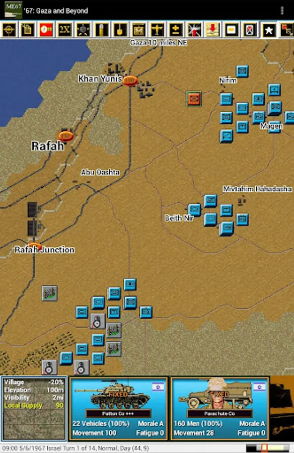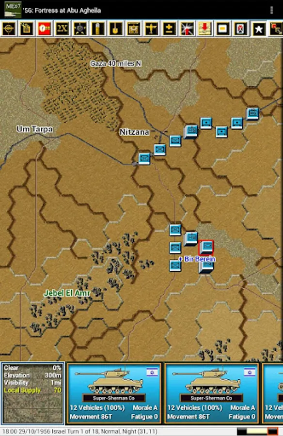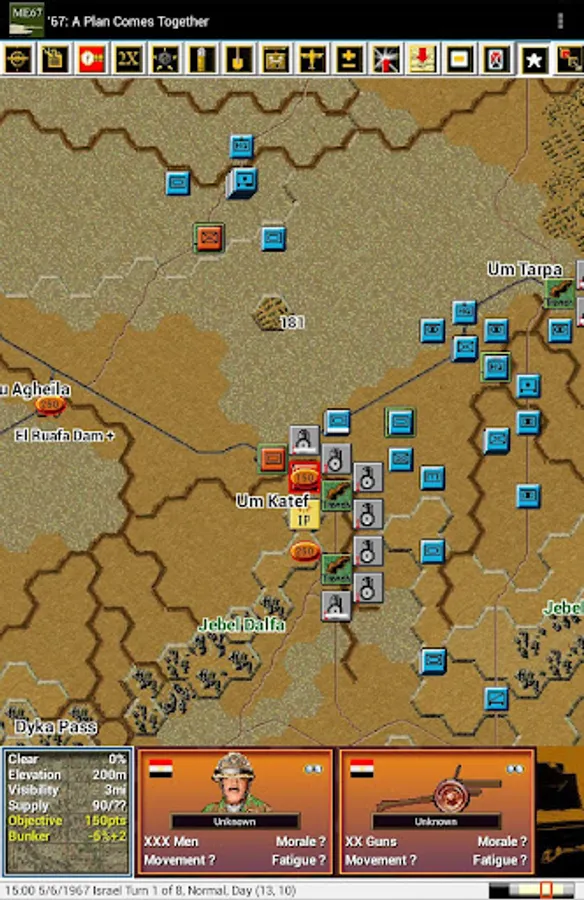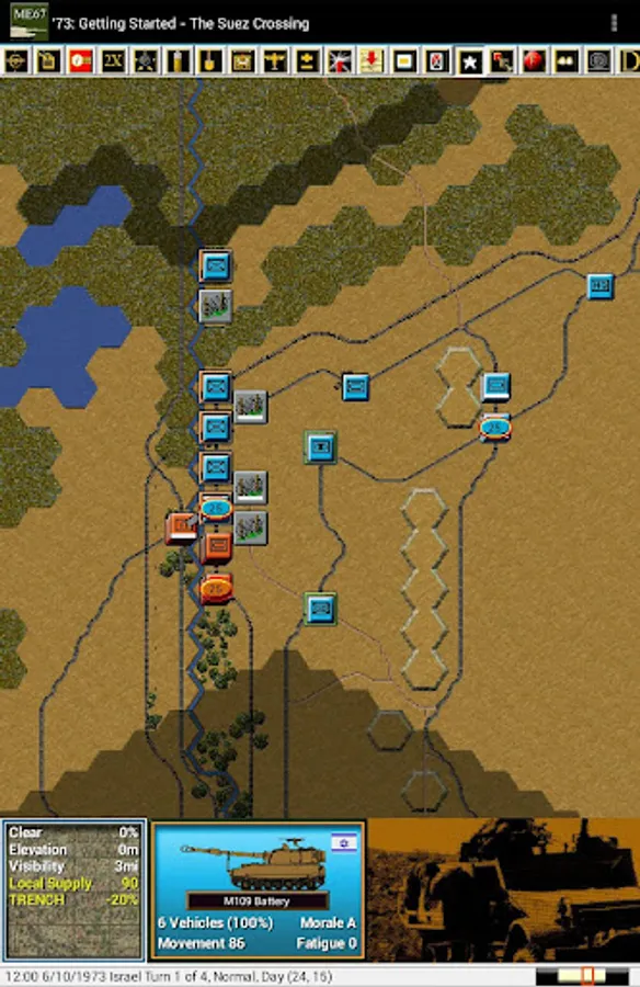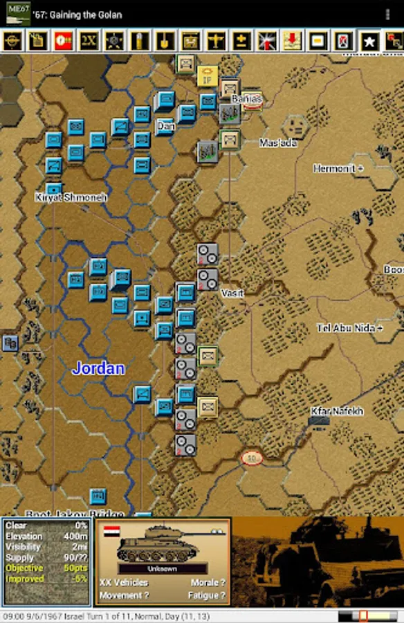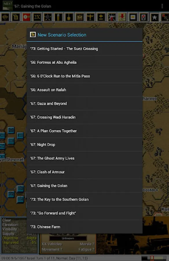 This is the first paid release in the mobile Modern Campaigns series. You should first install and play the free Panzer Campaigns and Modern Campaigns apps by John Tiller Software to become familiar with the interface and ensure that the app runs on your device. This release includes 14 scenarios from the Middle East '67 game for the PC all played from the perspective of the Israeli commander. The scenarios enable you to see the evolution of armored combat after World War II starting in 1956 (3 scenarios) and continuing through the 1967 Six Day War (7 scenarios) and culminating in the 1973 Yom Kippur War (4 scenarios). In each case, you face an A/I opponent playing the part of the Egyptian, Syrian, Jordanian, and Iraqi force commanders.