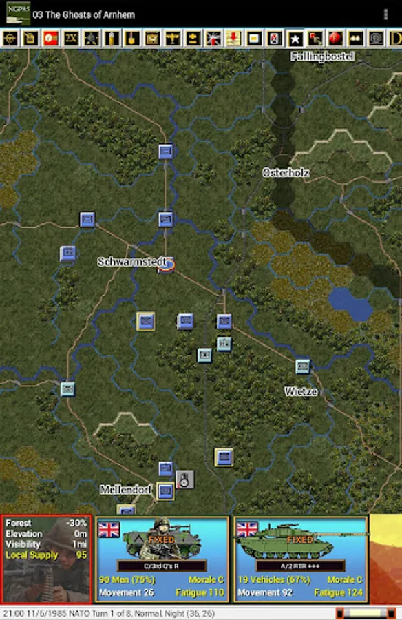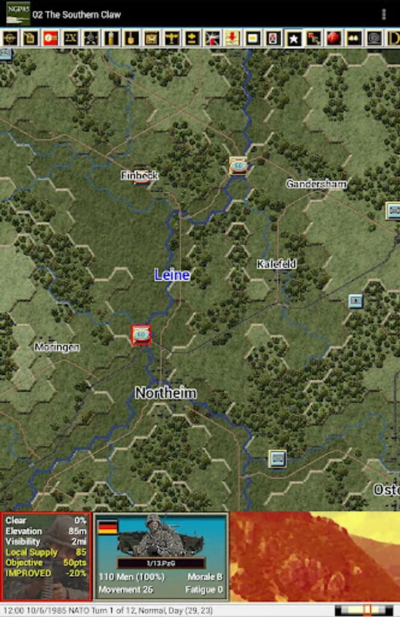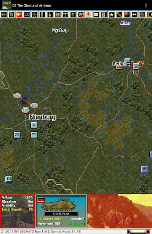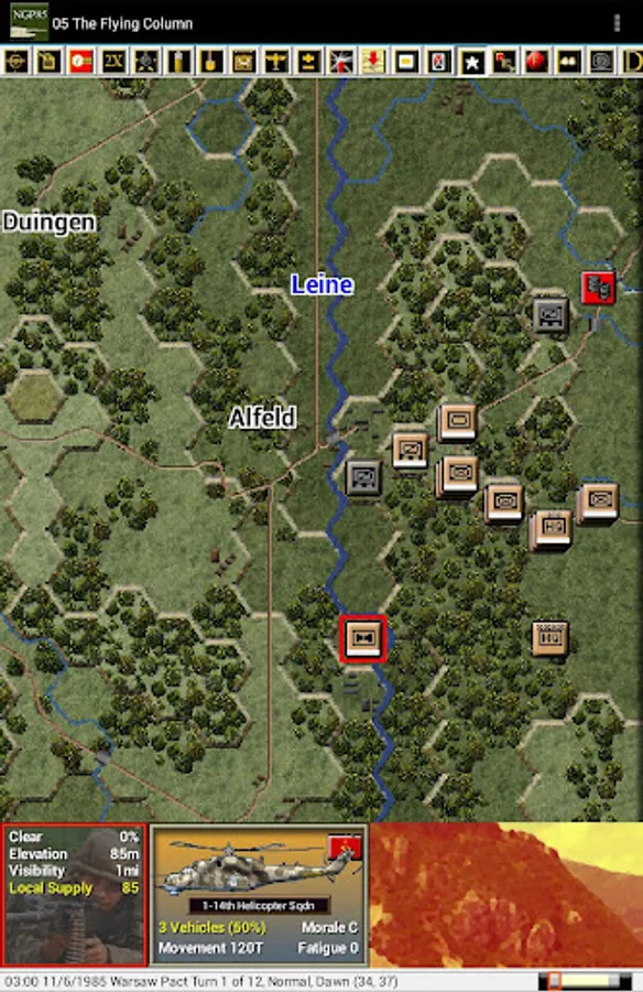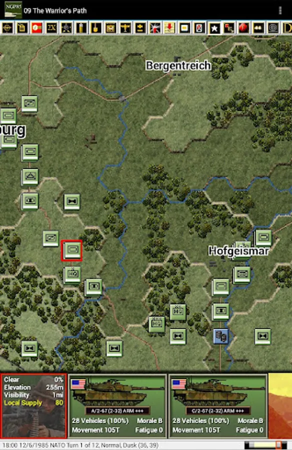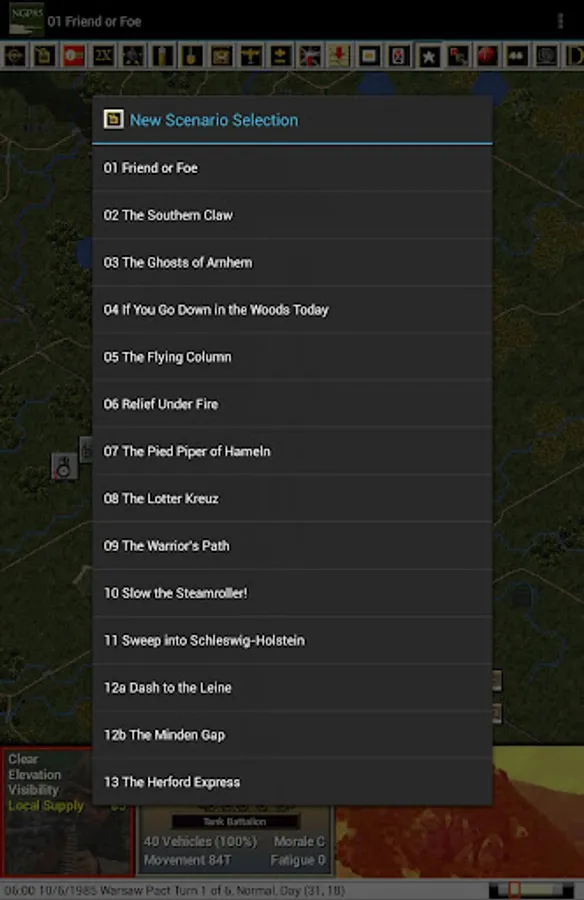 This is a paid release in the mobile Modern Campaigns series. You should first install and play the free Panzer Campaigns and Modern Campaigns apps by John Tiller Software to become familiar with the interface and ensure that the app runs on your device. This release includes 14 scenarios from the North German Plain '85 PC game where you play the Warsaw Pact commander in 5 scenarios and the NATO commander in the remaining 9. Note that this release has larger and longer scenarios than normal for our apps given both the nature of the north German terrain and changes by the designer to provide longer playing scenarios as requested by players in earlier game reviews.