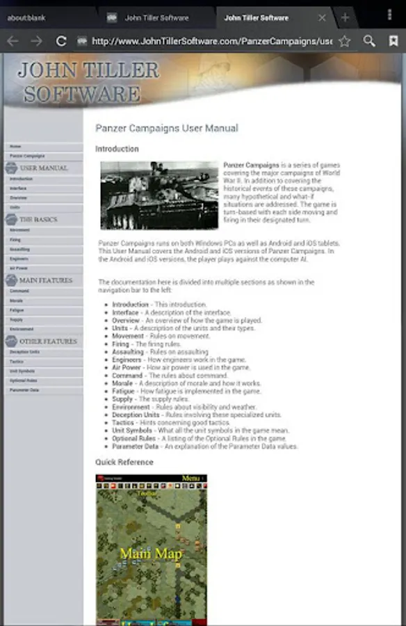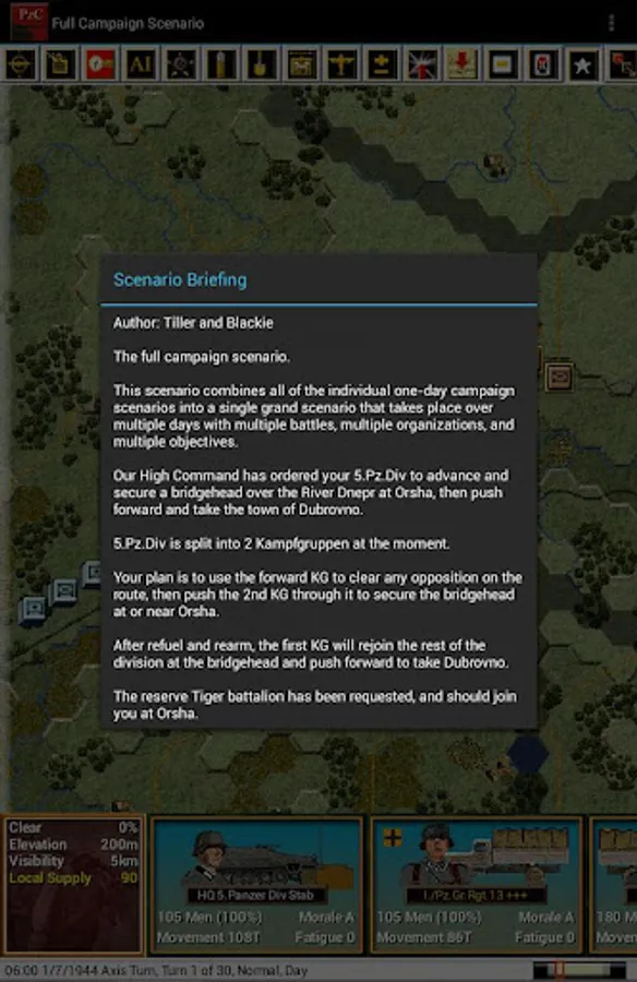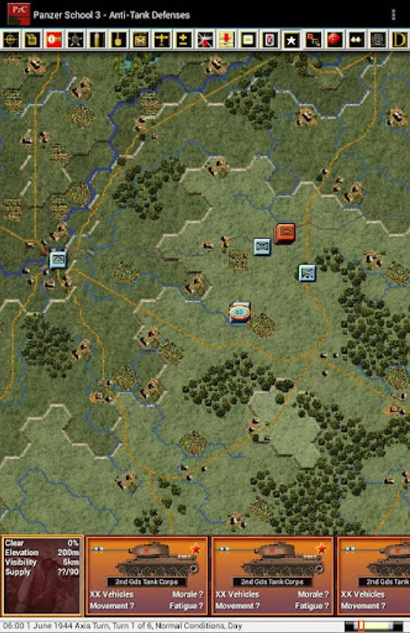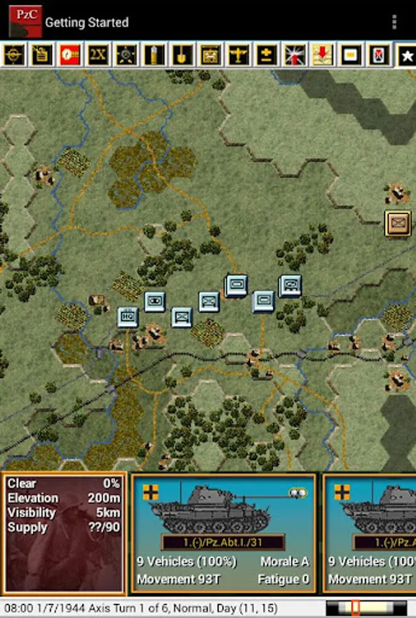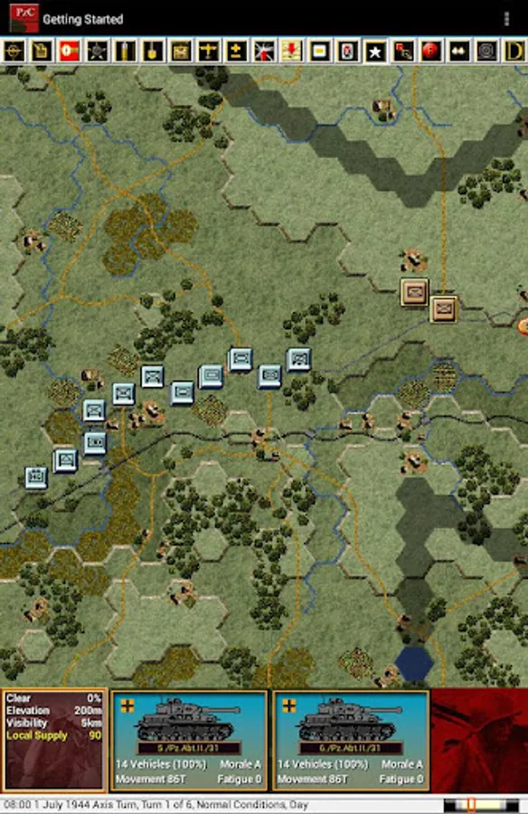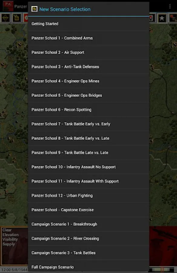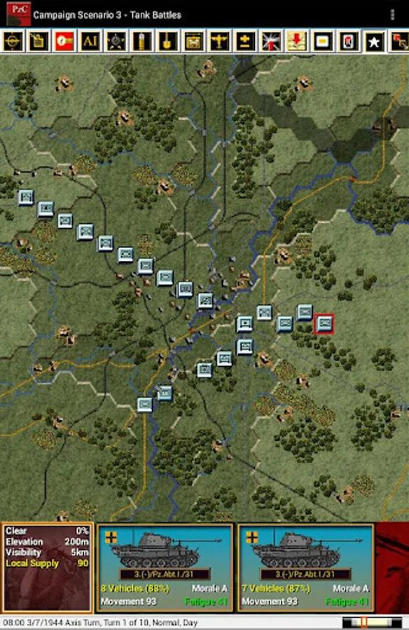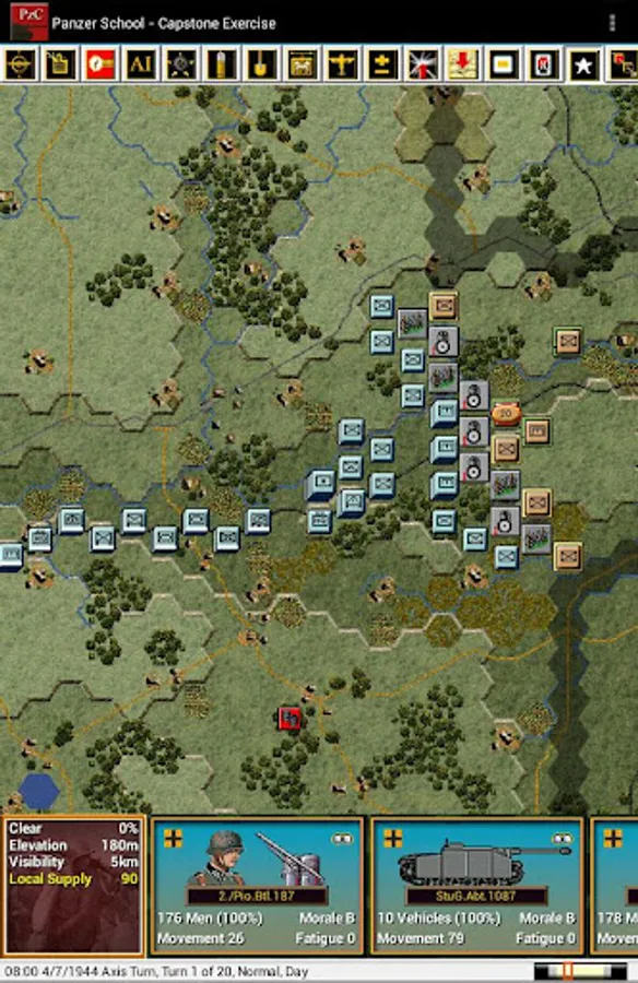 Panzer Campaigns is a detailed turn-based simulation of operational warfare from World War II. It includes detailed rules and combat resolution but has a simple interface that allows the player to focus on strategy and tactics. A wide variety of unit types are represented including infantry, tanks, artillery, and engineers. This version has 18 scenarios particularly suitable for mobile devices including 12 "Panzer School" scenarios designed to introduce you to the basics of World War II warfare.