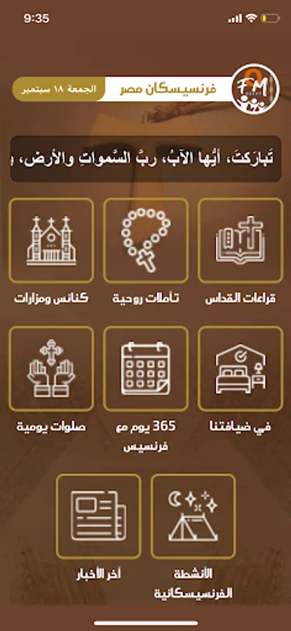 يمكنك متابعة قراءات القداس وصلوات الكنيسة اللاتينية يوميًا مع إمكانية سماع الإنجيل اليومي ومقتطفات من كتابات القديس فرنسيس. يتضمن أيضًا برامج الخلوات الروحية والأنشطة الفرنسيسكانية وأهم المزارات والكنائس الفرنسيسكانية بمصر وأماكن الضيافة بها.. وأخيرًا اخبار الرهبنة محليًا والكنيسة عالميًا.