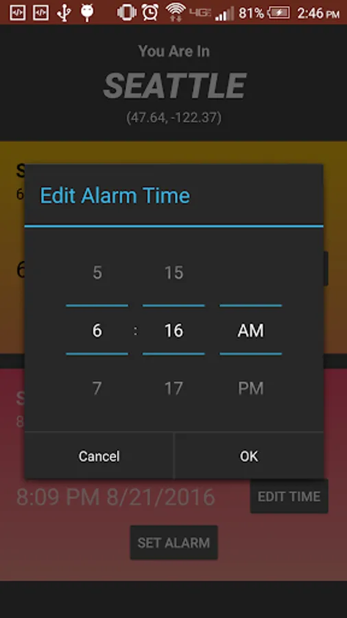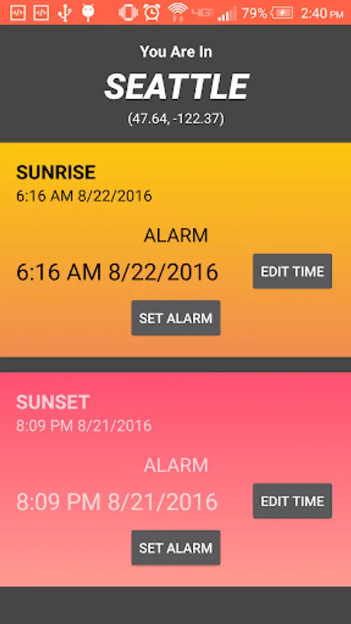 Sol Rise finds the next sunrise and sunset times for your location, and lets you adjust and set alarms to get ready to catch a beautiful view!