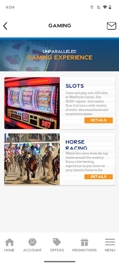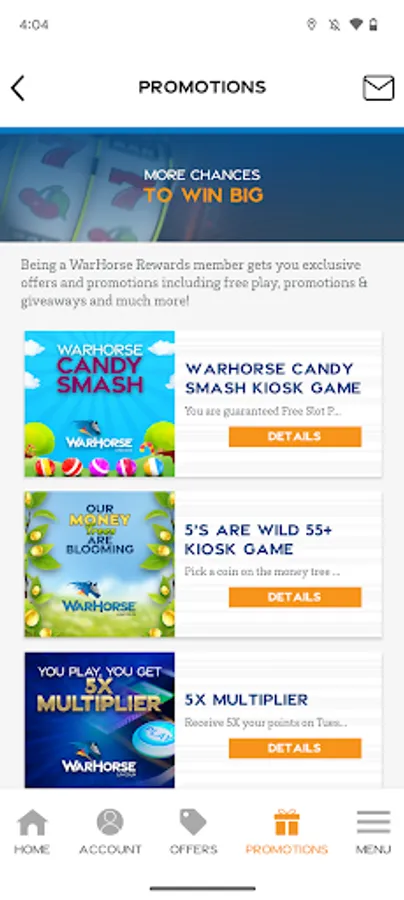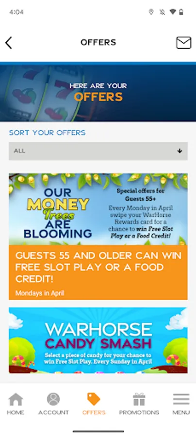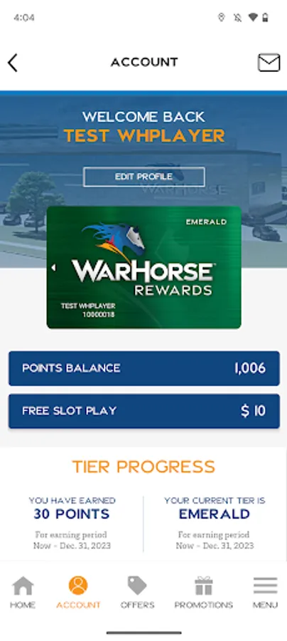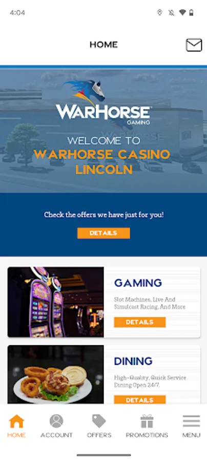 WarHorse Rewards Members can log in via the Account page to get the most out of the WarHorse Casino app! By logging in you’ll be able to view special offers like points and free slot play.