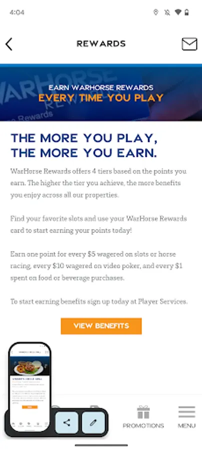 The WarHorse Casino mobile app gets you instant access to exciting promotions, special offers and more. For WarHorse Rewards Members, the experience gets even better. Log in to view point balances and access personalized offers.