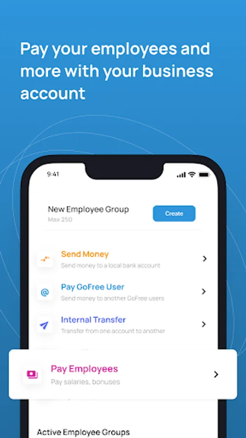GoFree Business app makes it possible to manage employee payroll on a mobile device, segment salary payments and clients payback. While providing cards in both virtual and physical types for instant business spending and bills payments.
