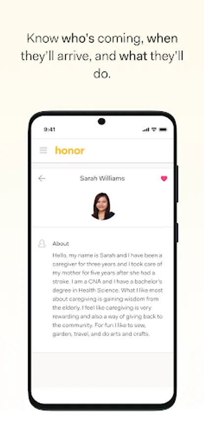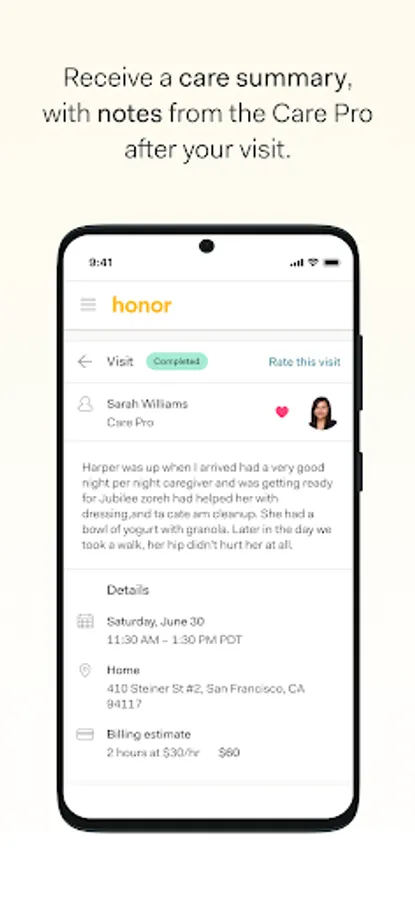 Honor provides in-home senior care, helping older adults continue to live well and independently at home. The Honor Family App lets you know who’s coming to the house for a care visit, exactly when they arrive and leave, and what tasks have been completed. It’s never been easier to manage care and companionship for yourself or your loved one.