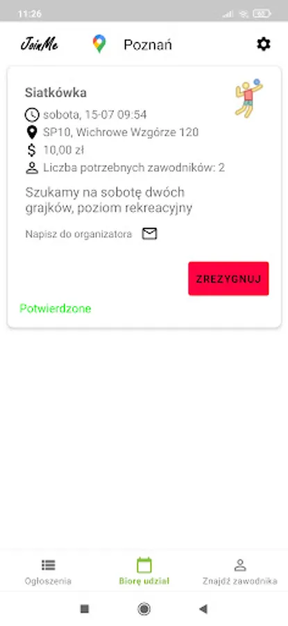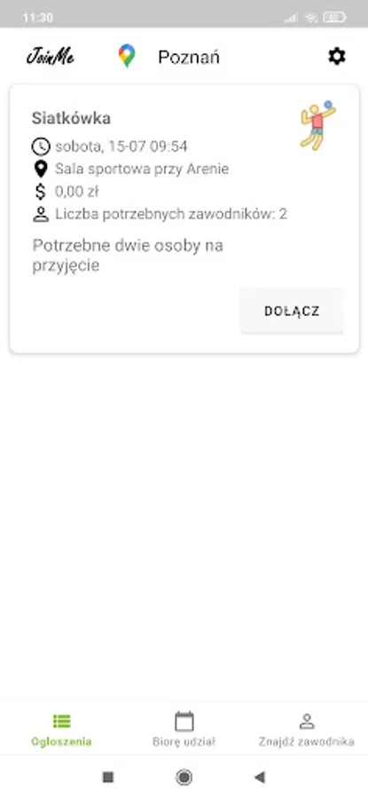 JoinMe is an application thanks to which you will find people willing to join the sport in your area. Tell us what you like to do and we'll find you company. Dozens of sports and a simple JoinMe interface will make finding a game much easier today.