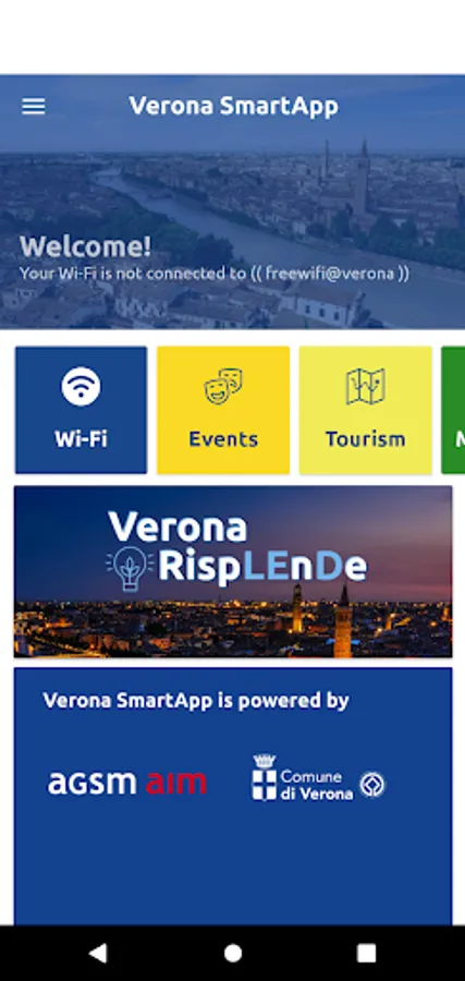 Verona SmartApp allows you to connect to public WiFi - a unified network providing free, unlimited high-speed internet access - and is set to become the official aggregation point for services and information on the City of Verona. An app for citizens and visitors, a virtual place where to find what you need, and make life in the city easier and more fun.