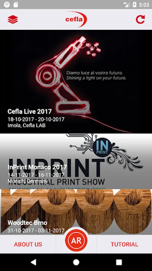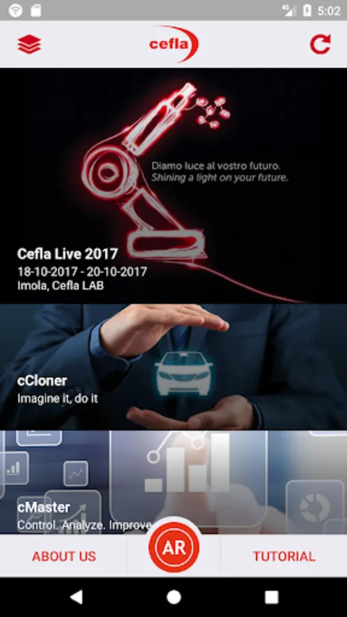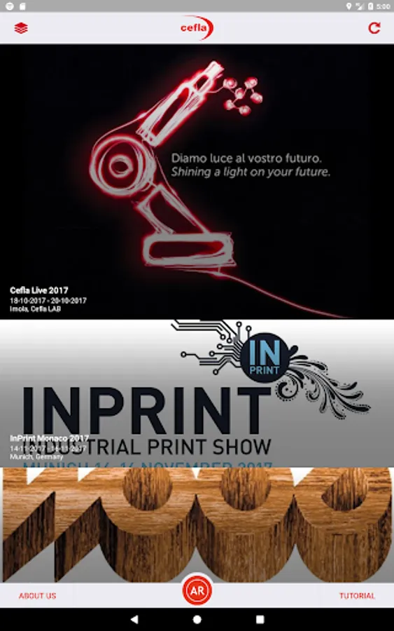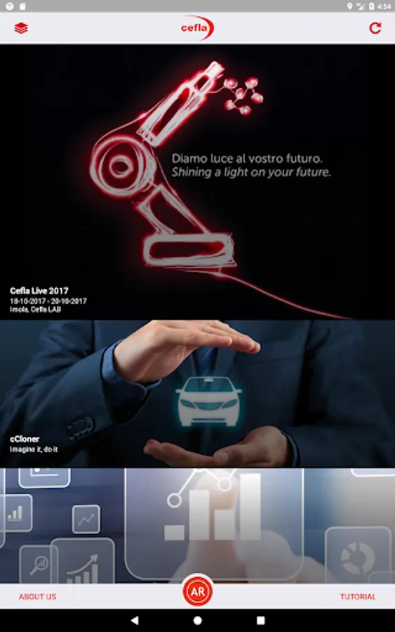 Cefla AR is the app that lets you experience an augmented reality and transforms a mere catalogue into a multimedia experience. With Cefla AR you can keep up-to-date on events, see the latest innovations of the world of Cefla in action and explore product features by means of videos and technical data sheets. Get the latest Finishing news with Cefla AR!
