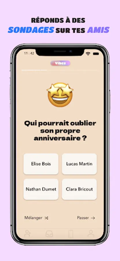 In one sentence: You answer funny polls about your friends and get VIBES when you are selected.