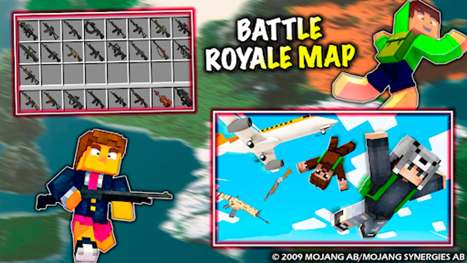 Now you have a chance to play a battle royale simulator in Minecraft PE. You start the game in an airplane and then drop off at the desired location. There is a choice between the following types of weapons and equipment: