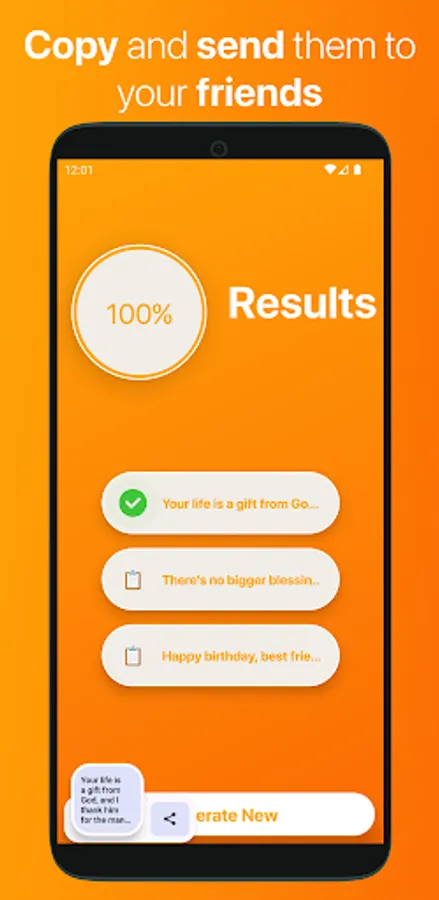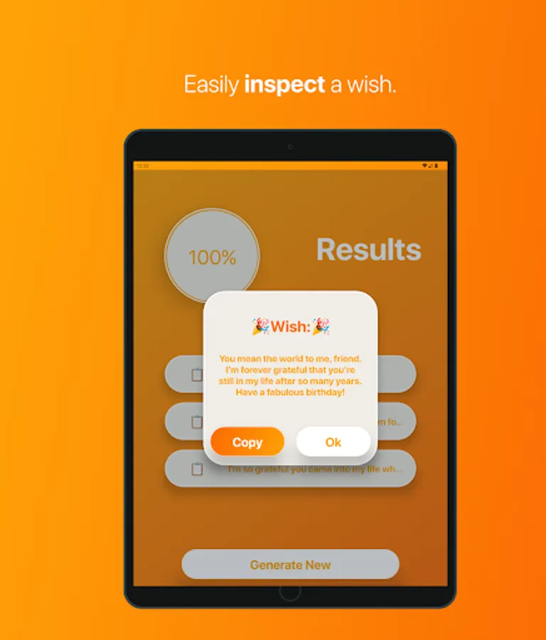 Have you ever were tired of searching for a good wish? This app is just for you, by choosing a gender and an age group it will generate you a wish for your friends birthday, you can easily copy and paste it to any social media platform, if you don’t like generated ones, you can always generate a new.