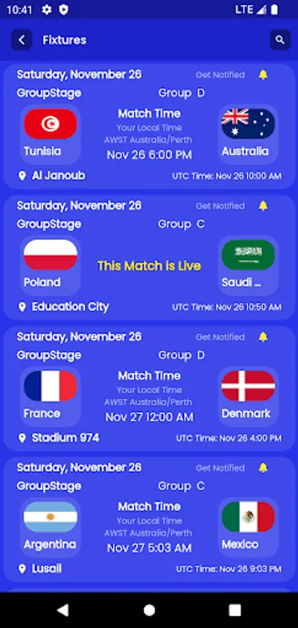 User can set notification to desired match. it will alert when match starts.