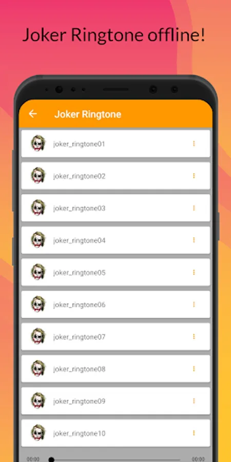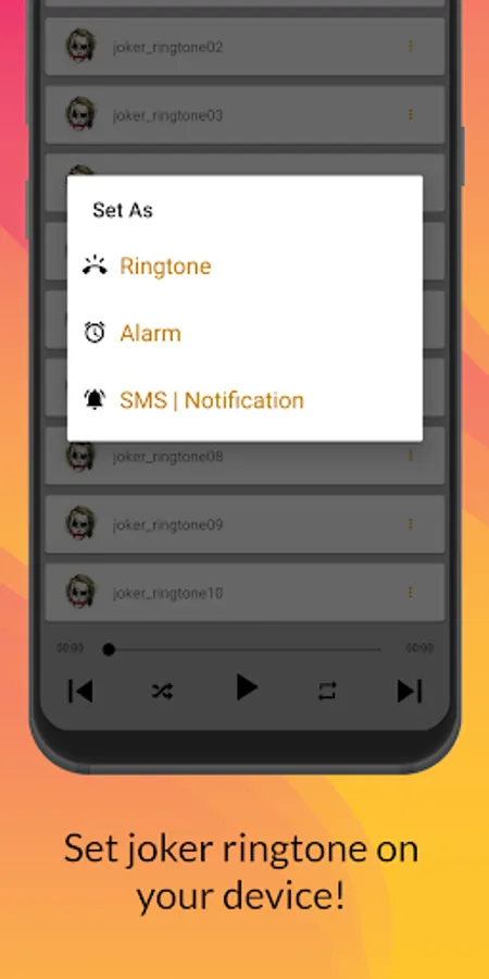 First, you can download this free Joker Ringtone app, Then you can press the " play " button to listen to the ringtone, and to set it as ringtone click on three-dot(⋮) and choose the ringtone you are done!