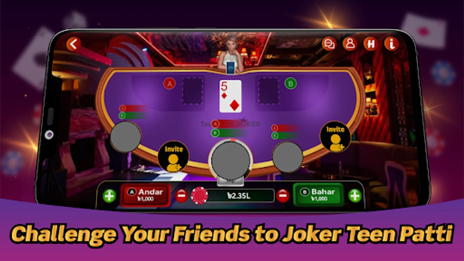 Joker Teen Patti also known as JTP-Poker is a Real-time simulated Online Multiplayer casino game where You can enjoy playing- Teen Patti play now, Poker, 3 different types of Andar-Bahar, Zero to nine, Lucky 7, Sic-Bo and many more with real-time players. Invite your friends and family members to join Joker Teen Patti so that you can play and enjoy your free time.