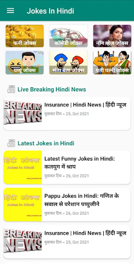 Jokes in Hindi- Funny Jokes Hindi. This App provides you Collection of Popular and latest Jokes in hindi. funny Jokes and Chutkule in Hindi. We present you some of the best and funniest jokes. This is an online app that gives you a variety of jokes Collection like comedy Jokes, pati patni Jokes, Non Veg Jokes, Santa Banta jokes, Pappu Jokes lots of funny jokes all in one App. Everyday daily we provide latest Jokes in Hindi. So Entertainment yourself. So guys just enjoy these jokes and laugh louder.. We are also Provides Latest Entertainment News in Hindi. This app also Latest Hindi News about progressive, travelers, farmer, car, travel, Health, life insurance, What is insurance policy, Insurance type, insurance renewal, bike and so on.