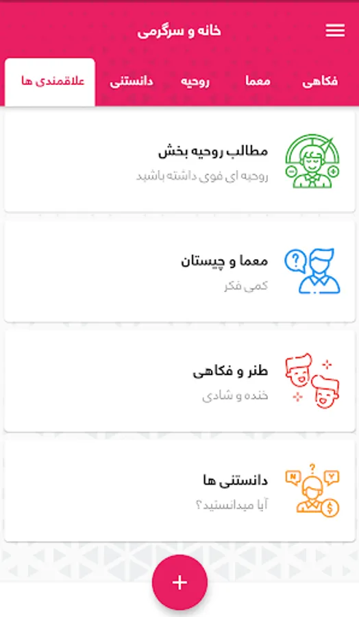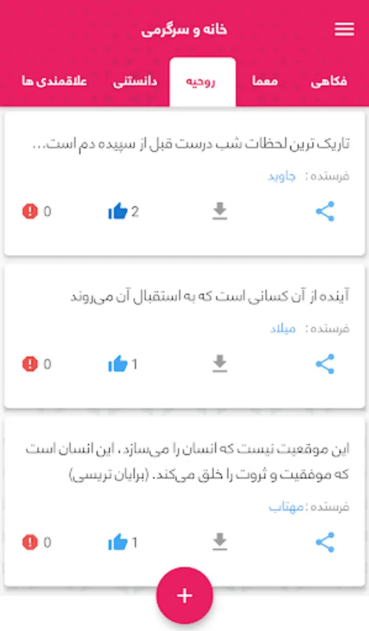 The app includes mock-ups, jokes and jokes, puzzles and riddles. The structure of the application is such that its users publish content in line with these categories, and in a way, it is an application for publishing good and entertaining content. Each article has a scoring section and can be republished. Items that receive more than two negative votes will also be automatically deleted. Users can save their favorite content to study offline in the favorites list.