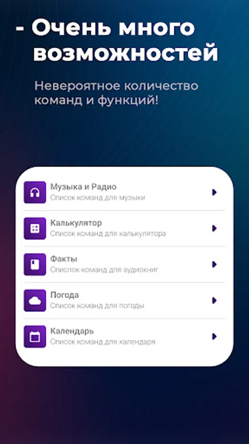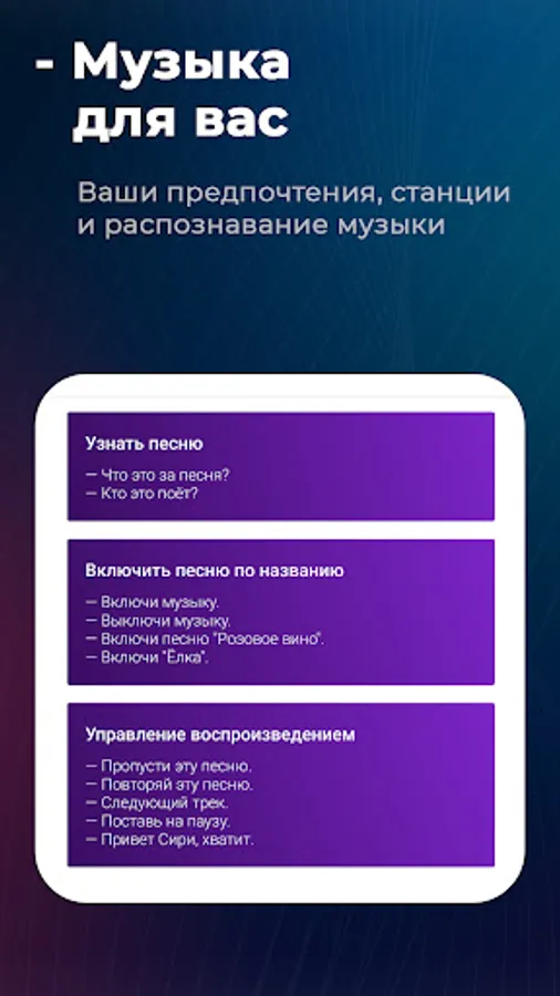 Please note that this "Commands for Siri" application does not have a built-in Siri voice assistant. This is a reference application with commands for the voice assistant Siri. Here you will find a complete list of voice commands divided into categories.
