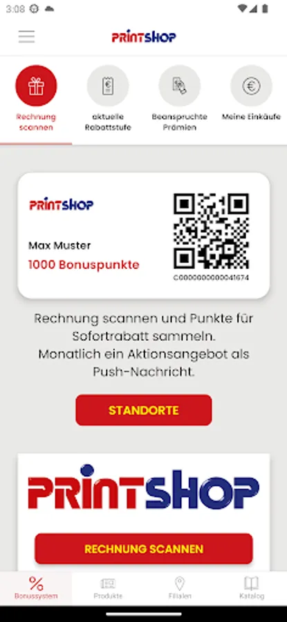 Collect 10 points for every 1 euro you spend. With 1000 points you get 3 euros, with 2000 points 10 euros, with 3000 points already 20 euros discount on your next purchase. All you need to do is scan your receipt with the camera on your smartphone. No cash payment possible!