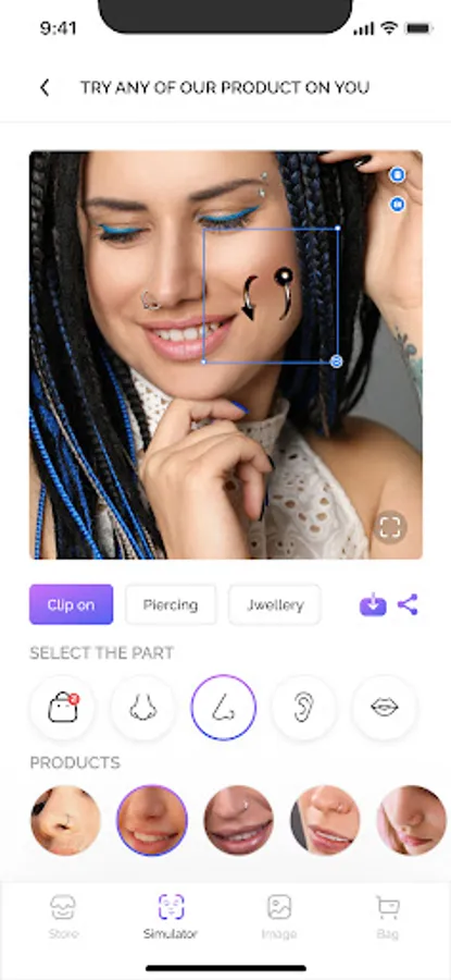 In order to try piercing jewelry, you either need to upload a photo or use the piercing simulator and make a photo using the simulator’s face frame. Then you can try different piercing jewelry, reduce and increase the size, rotate the piercing, and more!