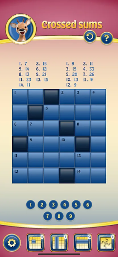 Fill the empty squares so that the sum of each horizontal combination equals the clue on its left, and the sum of each vertical combination equals the clue on its top.