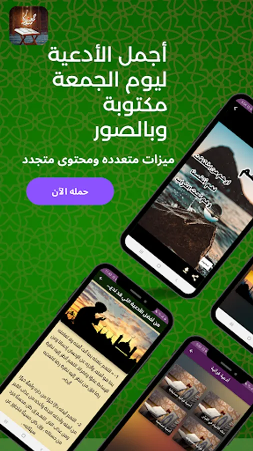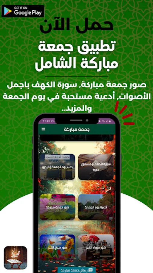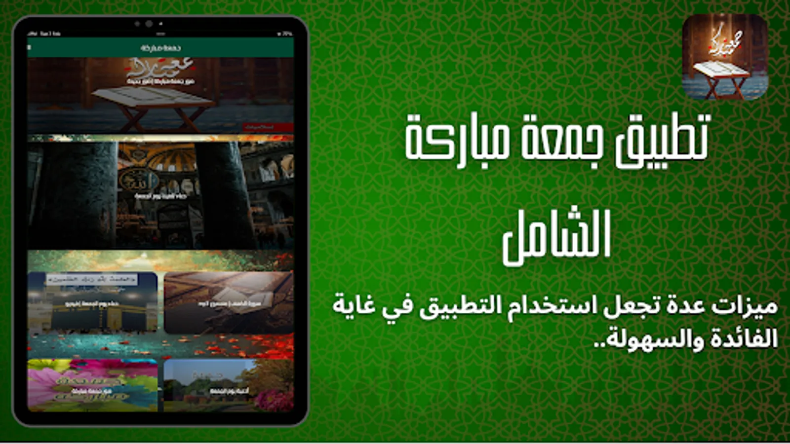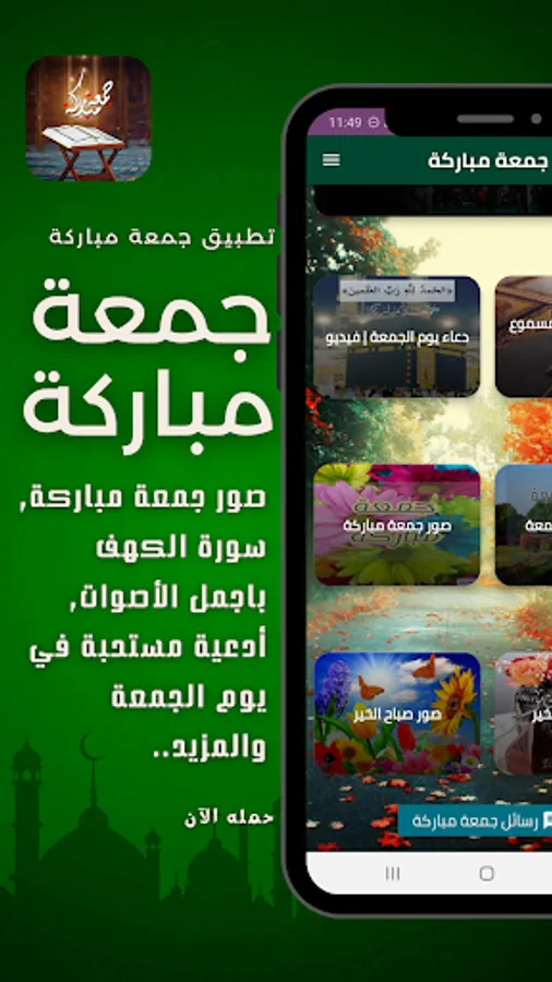 يوم الجمعة هو أكثر الأيام بركة في الاسبوع , لذلك خبر الرسول عليه أفضل الصلاة والسلام ان يوم الجمعة هو يوم عيد عند المسلمين , ومن هذا المنطلق ابدينا اهتماما كبير في تطبيق جمعة مباركة ليكون الأشمل للمسلم من حيث المحتوى لذلك تجد في اجمل ادعية يوم الجمعه المستجابة والمحببه لدى الله جل جلاله وايضا سورة الكهف التي قال فيها الحبيب من قرأ سورة الكهف في يوم الجمعة سطع له نورٌ من تحت قدميه إلى عَنان السماء، يُضيء له يوم القيامة، وغُفر له ما بين الجمعتين , لذلك نذهب نغتسل ونتطيب ونجهز انفسنا لصلاة الجمعة , ومن منا لا يحب مشاركة فضل هذا اليوم المبارك مع العائلة والجميع؟ إذن انت تحب أن تشارك أصدقائك والجميع بعض من صور جمعة مباركة اليس كذلك ؟ إذن قم بتحميل تطبيق جمعة مباركة لاكتشاف العديد من بطاقات التهنئة للهاتف لصور جمعة مباركة للشاشة الرئيسة ولقفل الشاشة لتتمتع بمظهر رائع ولطيف لخلفية هاتفك. هذا التطبيق سهل الإستخدام وبسيط لتحميل الصور ومشاركتها.