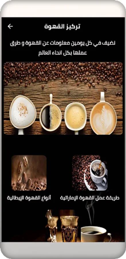 يحتوي تطبيق على تركيز الكافيين في القهوة , كوفي تركيز القهوه , مقهى تركيز القهوة , قوة تركيز القهوة لتعرف معلومات اكثر عن القهوة و طرق عملها باحدث الطرق .