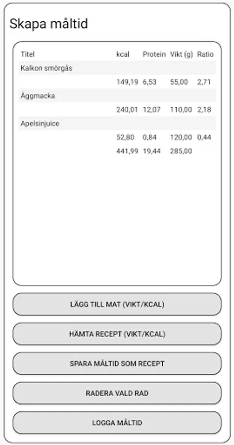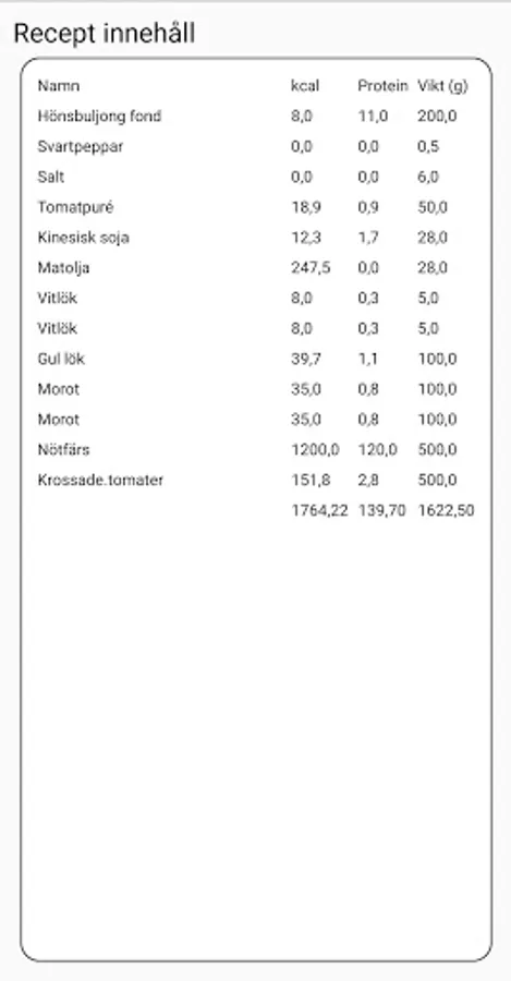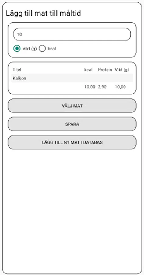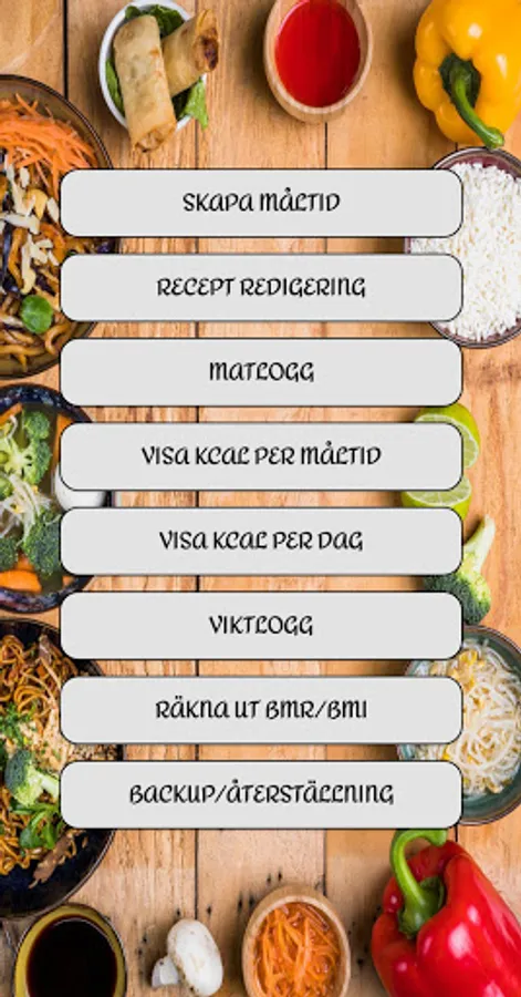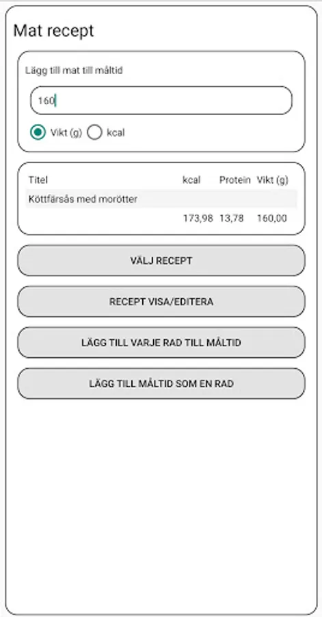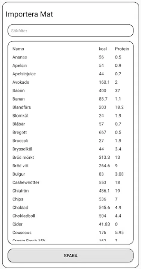 With this English/Swedish app you can create meals from recipes that you create in the app or from your own food database and where you can import from it with the included food database. You can easily see how many calories, protein and weight you put in you. When you add the meal, you can do it from kcal or weight and it will convert automatically. There is also a weight log and you can see for each day how much kcal you use. The app also includes a calculator of BMR and BMI. Backup can be done to a file on the file system or Goggle Drive. Improvements will be made regularly and suggestions are welcome. Recipes can be saved on one file and shared with others.