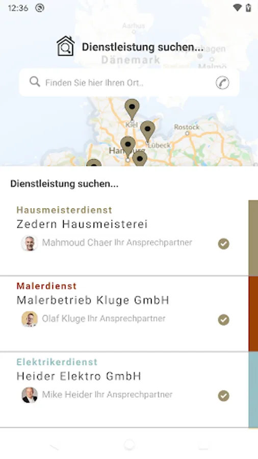 Our app will find the right contact for you for the services listed here: caretaker, painter, electrician, heating, air conditioning, plumbing, alarm systems, smoke detectors, asbestos removal, pigeon deterrent, pest control, garden maintenance, moving service and cleaning service.