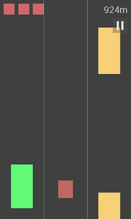 As a green rectangle you drive a race and you have to dodge oncoming like rectangles. Collect items on your way as "extra life" or "bonus meter" to you at an advantage. If you run out of lives the game is over. The distance traveled is your score.