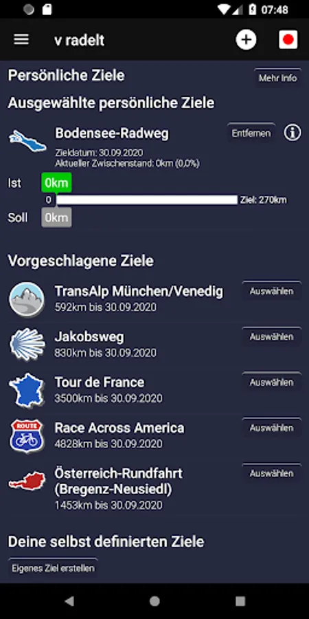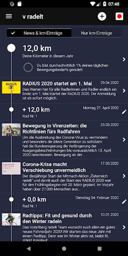 Recording of the kilometers cycled as part of RADIUS “Vorarlberg Radelt”. Gives insight into the personal statistics of the cycled distance, offers the opportunity to "track" cycled distances and vertical meters of individual routes, set personal cycling goals or compare them with friends, carry out a team race, call up the weather forecast and business trips by bike easy to grasp.