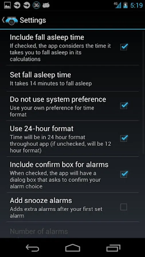 [✔]The ability to set how long it takes you to fall asleep and 90night will use that time in its calculations