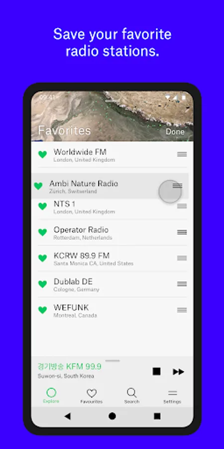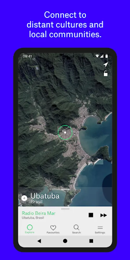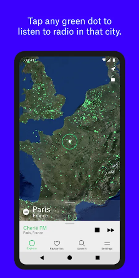 Every green dot represents a city or town. Tap on it to tune into the radio stations broadcasting from that city.